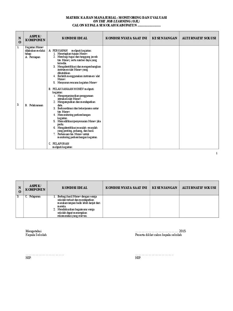 · mengidentifikasi dan mengembangkan instrumen/alat monev yang dibutuhkan. Matrik kajian manajerial di sekolah asal dan sekolah magang. D instrumen kajian monev.doc · iii. Download contoh format ojl (on the job learning) kepala sekolah sd, smp dan sma terbaru 2015.